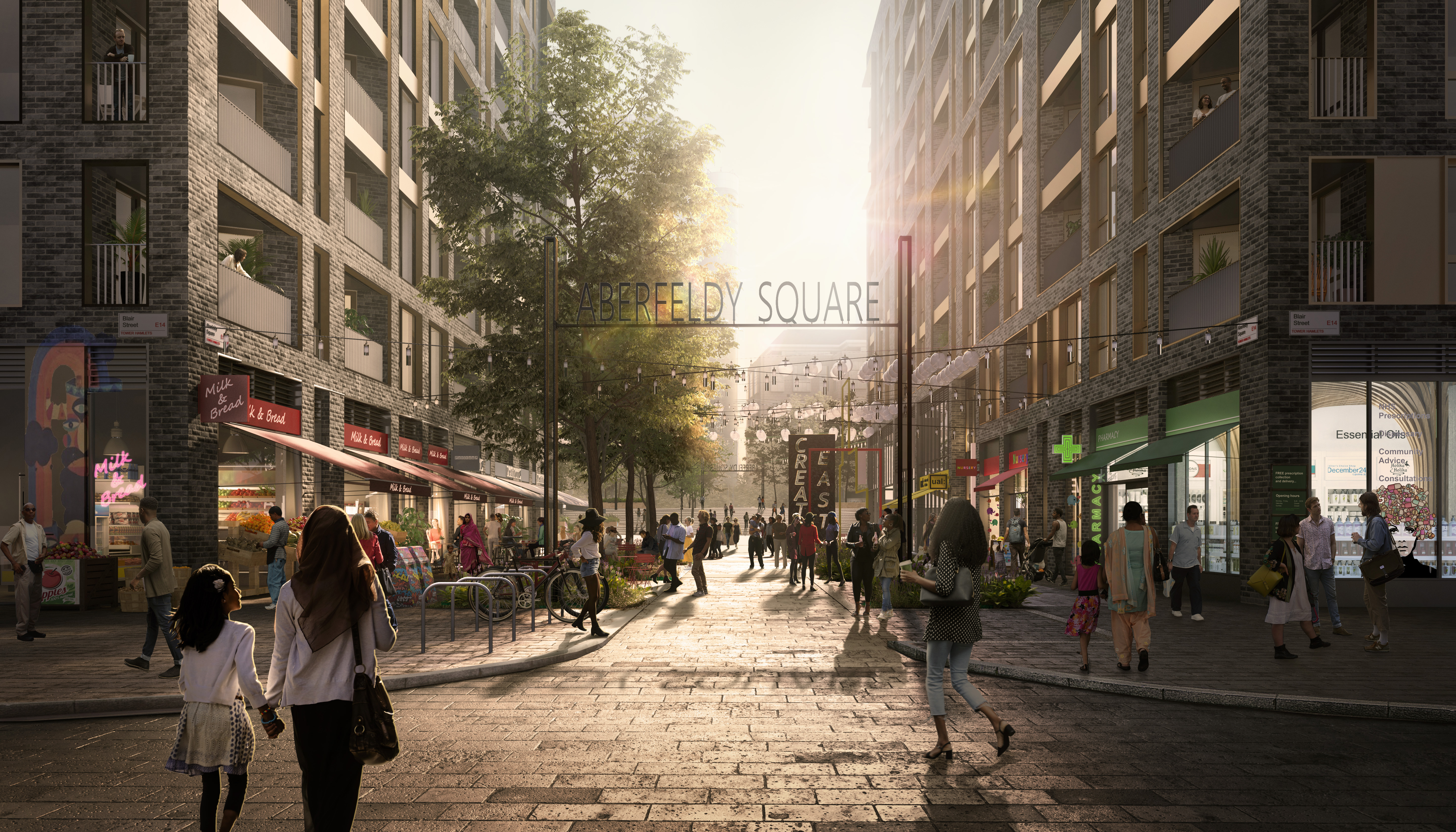 The client was keen to make the development, particularly the main street feel like an established London high street, one that has always been there. Extensive research was carried out around areas such as Broadway Market and Columbia Road in east London to try to capture an authentic feeling of a bespoke street with independent shops and village life.
