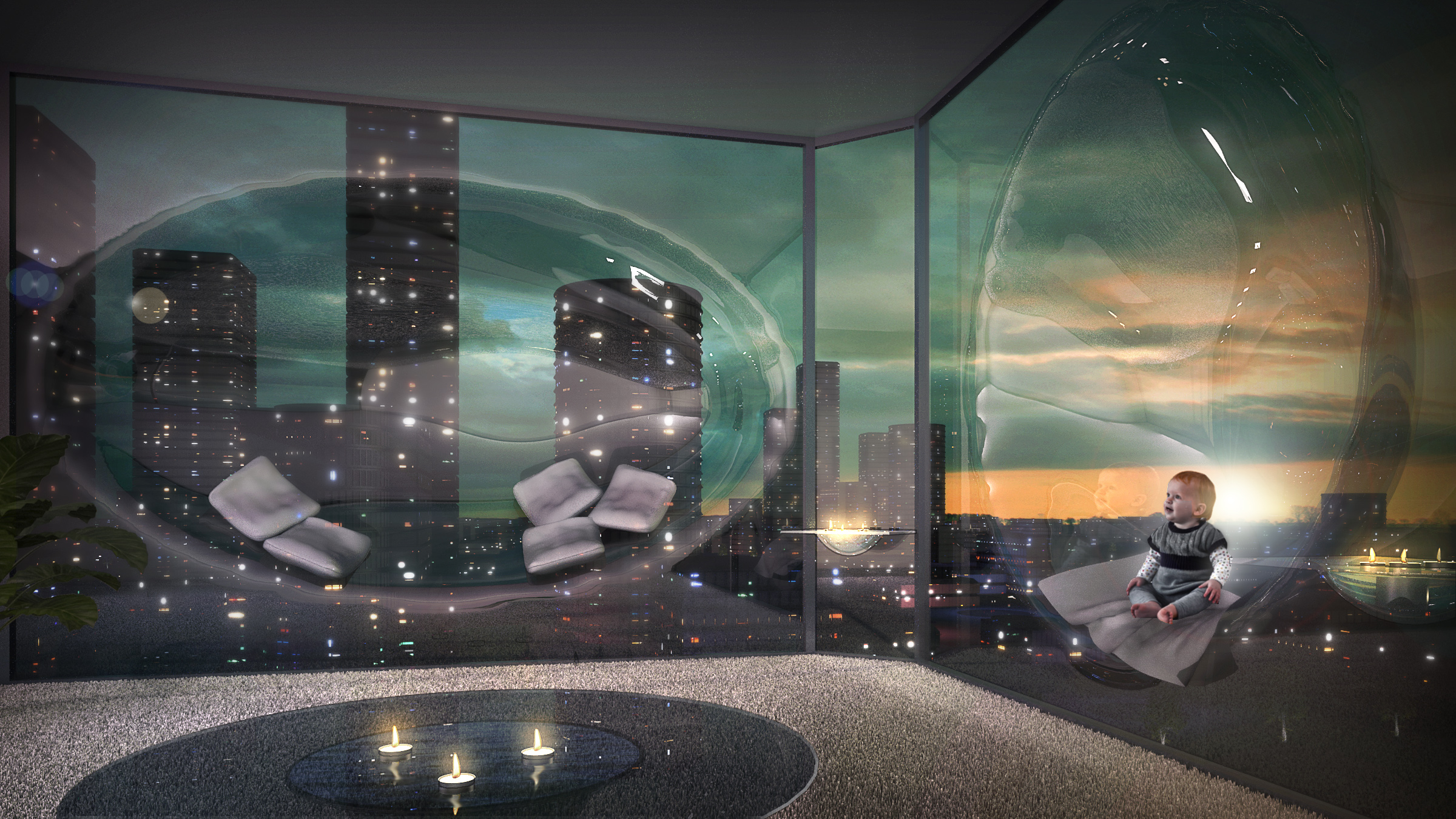 This image is created for fun. I had the idea of making glass bubble chairs and couches integrated in the window frame for quite some time and the CG Arch. Award 2013 was the perfect opportunity and motivation to finish the idea.