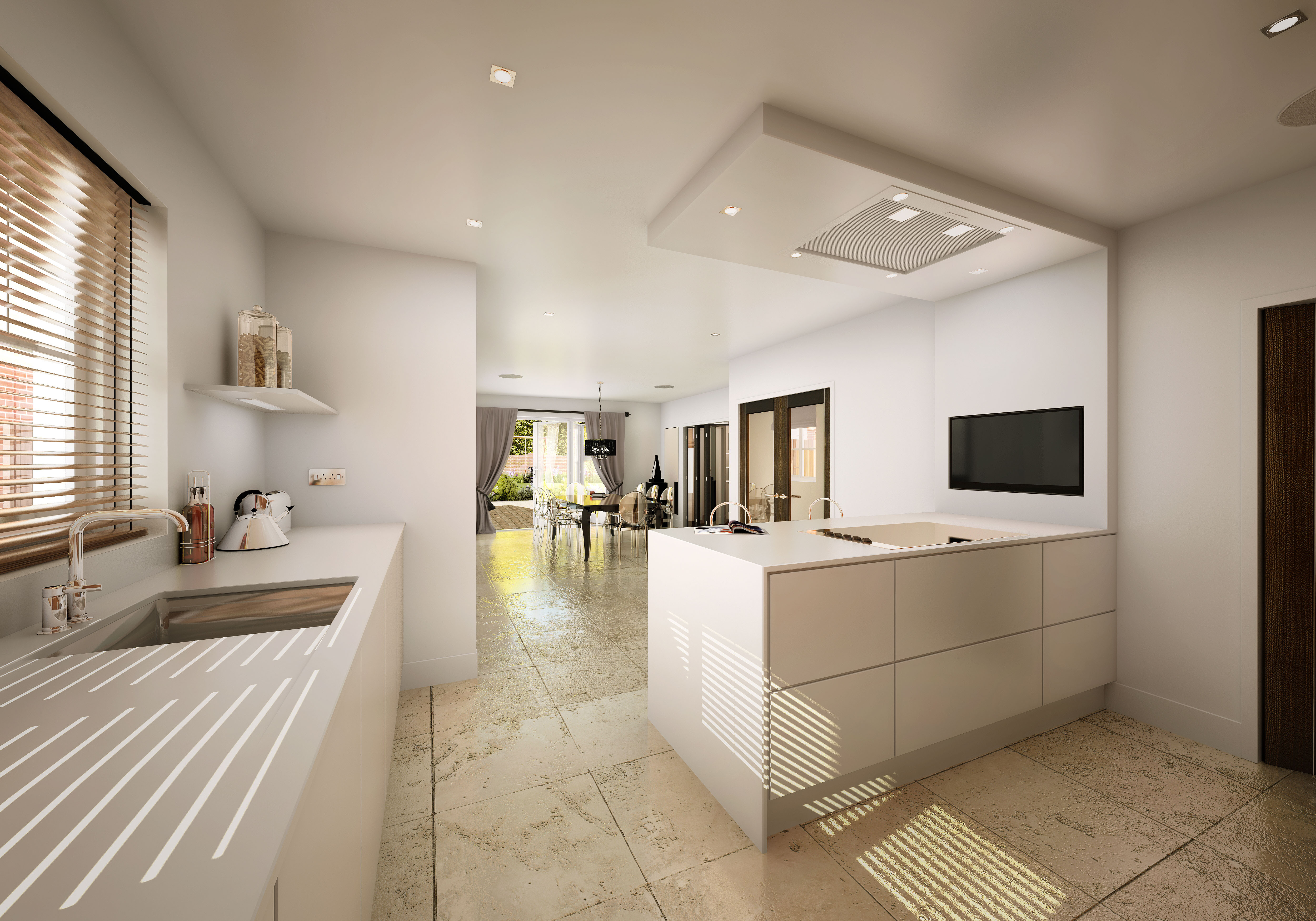 ion, this room flows from the cooking heart, through to the dinning area and from there trifold doors lead you either into the lounge space or into the garden, creating the feeling of a plethora of space, working for every family member. The brief for this image was to create a homely feel to appeal to a family of 4 or 5. A new house with modern features but a mature outlook on living.