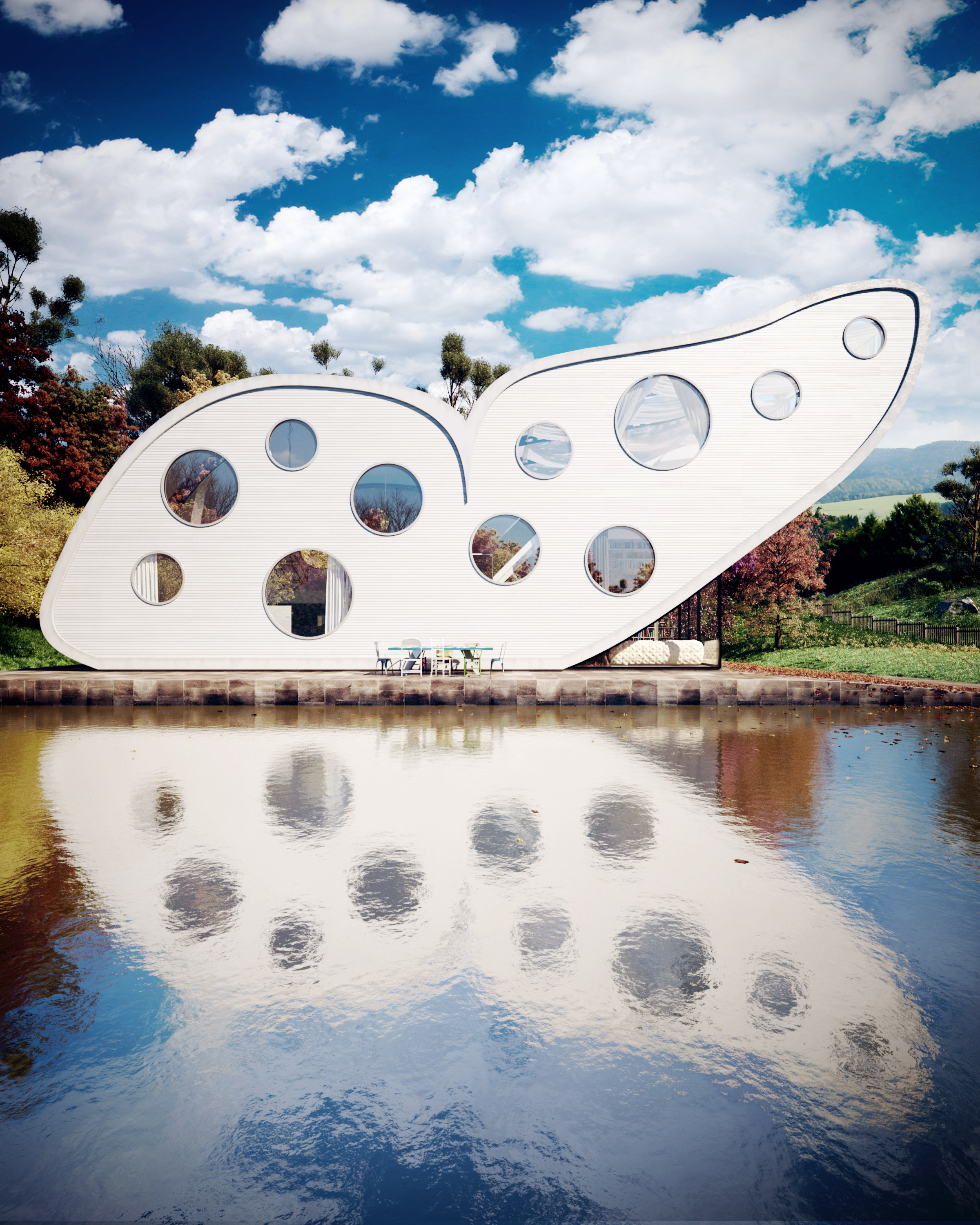 I was really really tired to see the same kind of 3D architectural images: Box house on middle of trees or just lofts with same furniture. So I mixed this two problems and thought in a solution., using the butterfly main idea. It was just think "outside the box".