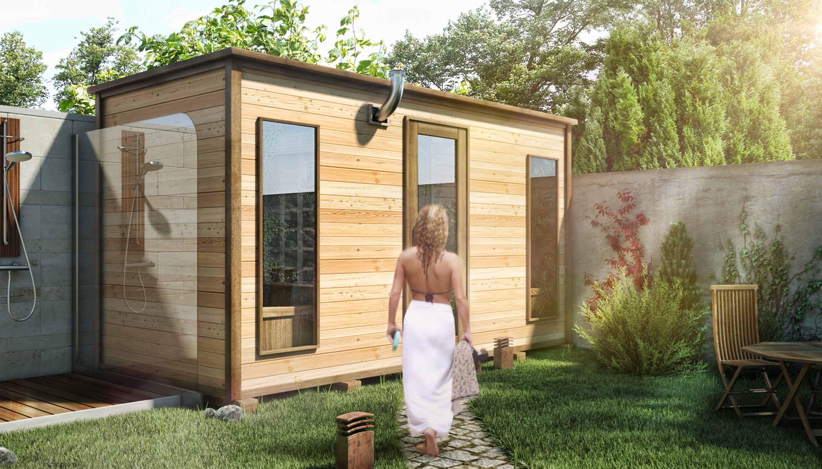 Integration of a small sauna in a private garden.