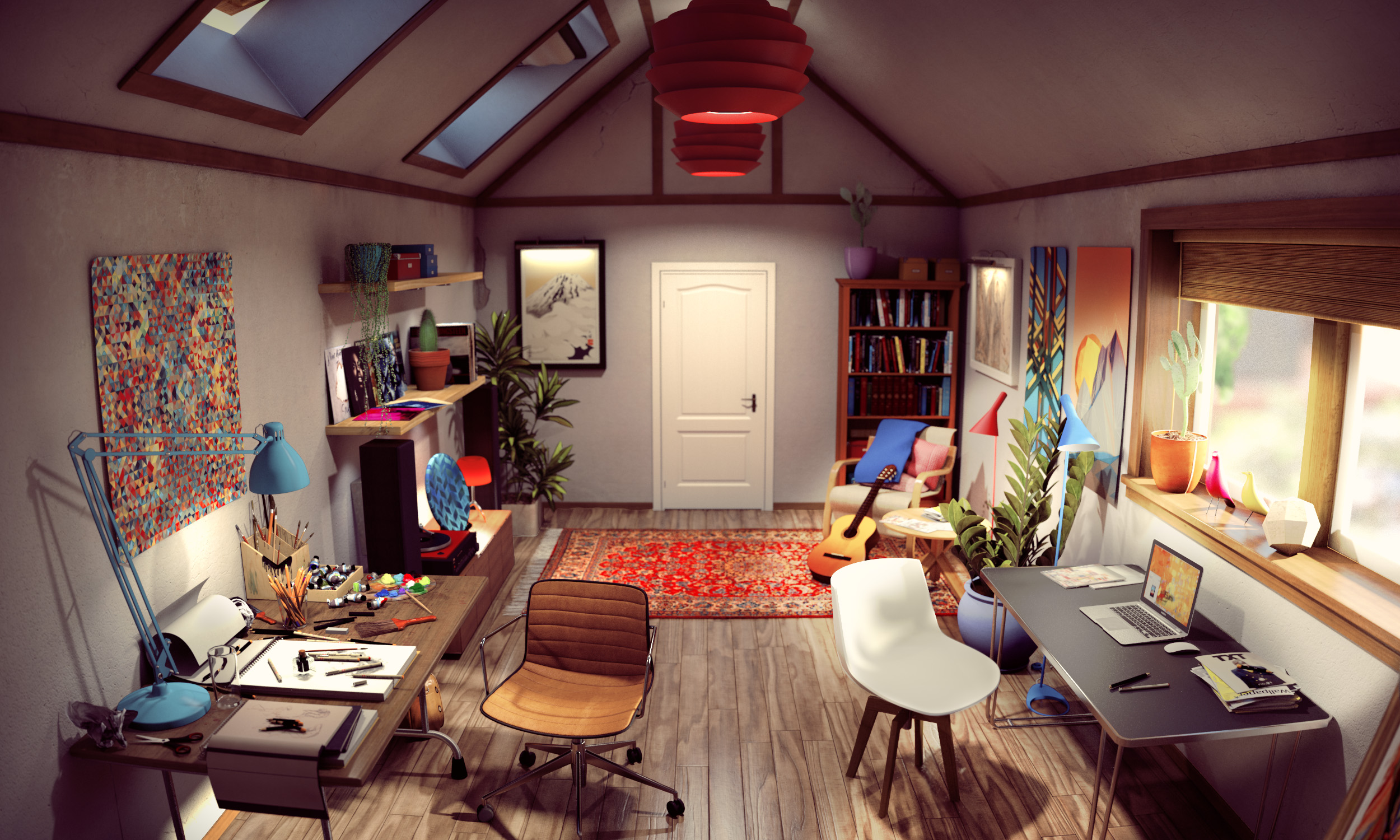 My goal was to capture a room that looks "lived in", as if the artist is in the middle of a project and left the room to put the kettle on. By adding lots of small details around the room I filled out the flat surfaces while learning a lot about how the V-ray renderer reacts to materials and lights.
