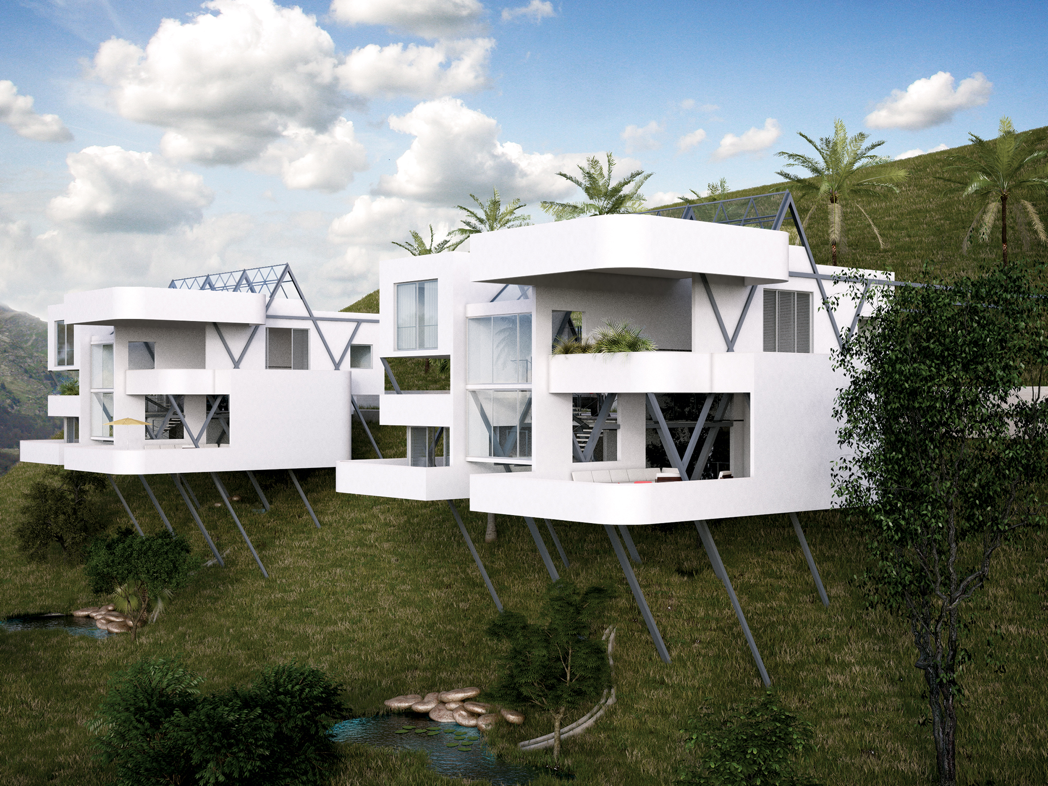 First design approach to a country house supported by a cantilever-steel structure.