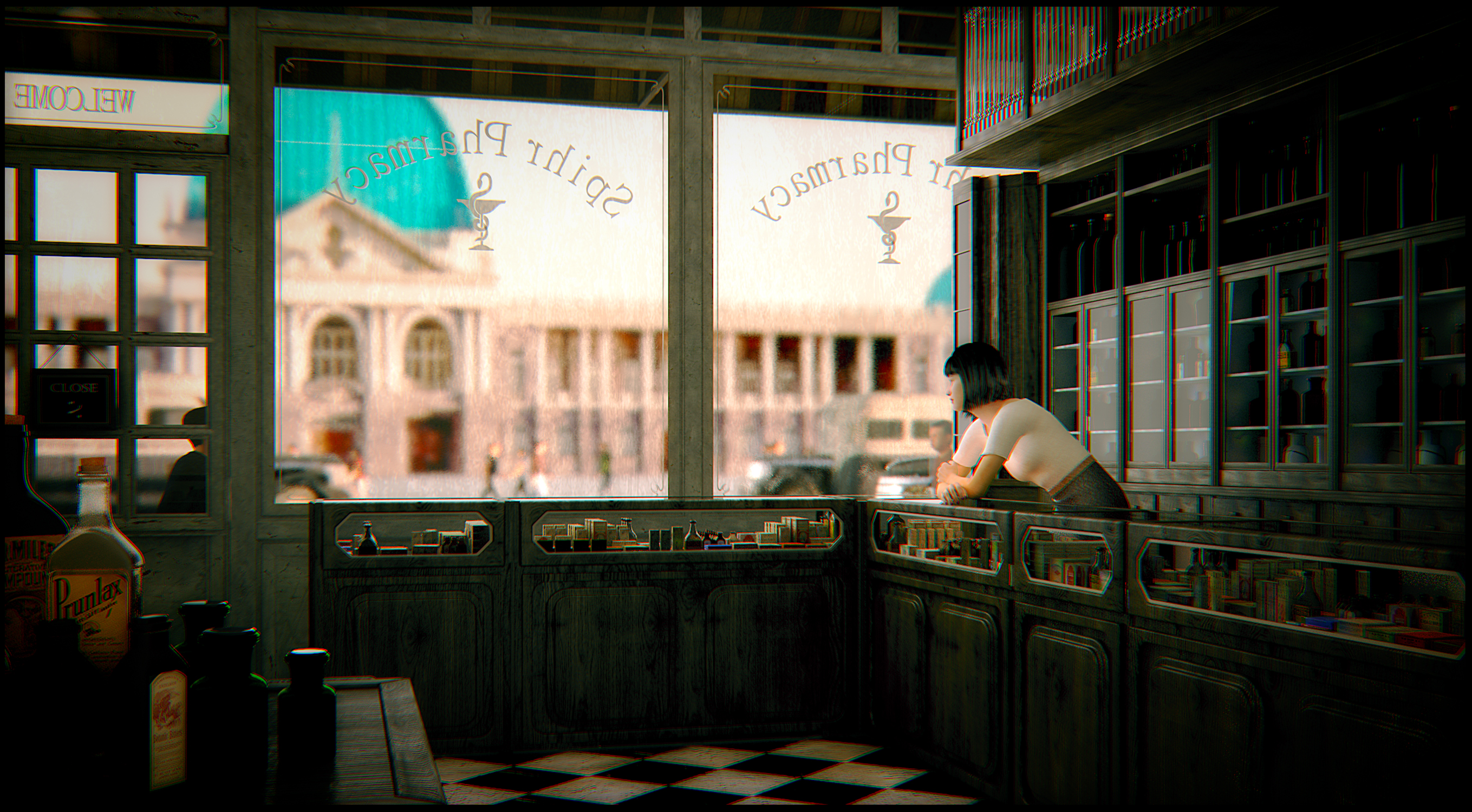 Post & Telegraph Building view from an imaginary pharmacy in olden Tehran.