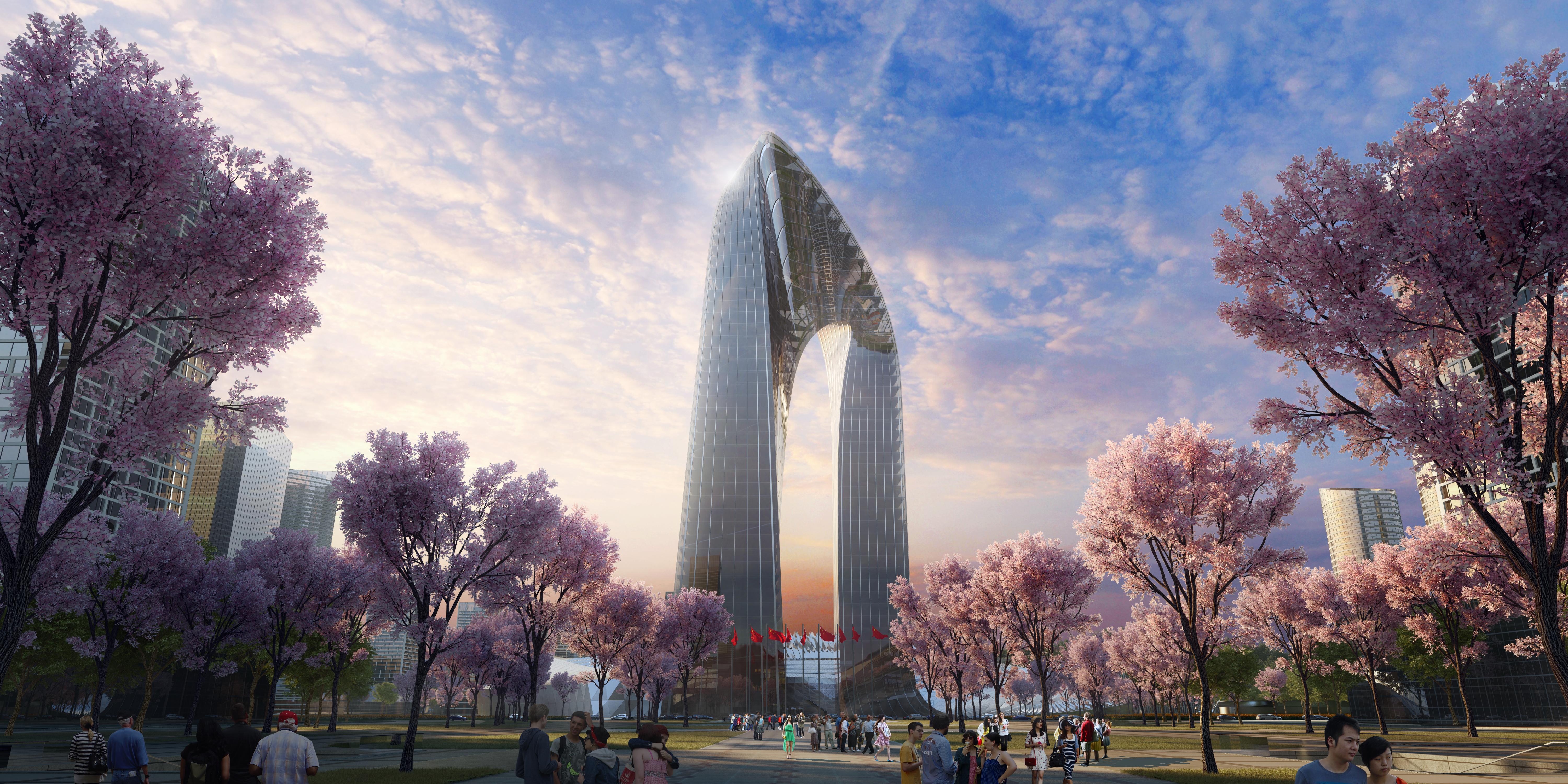 Cherry blossom trees render is inspired by Asian landscape design culture as the project is situated in China.