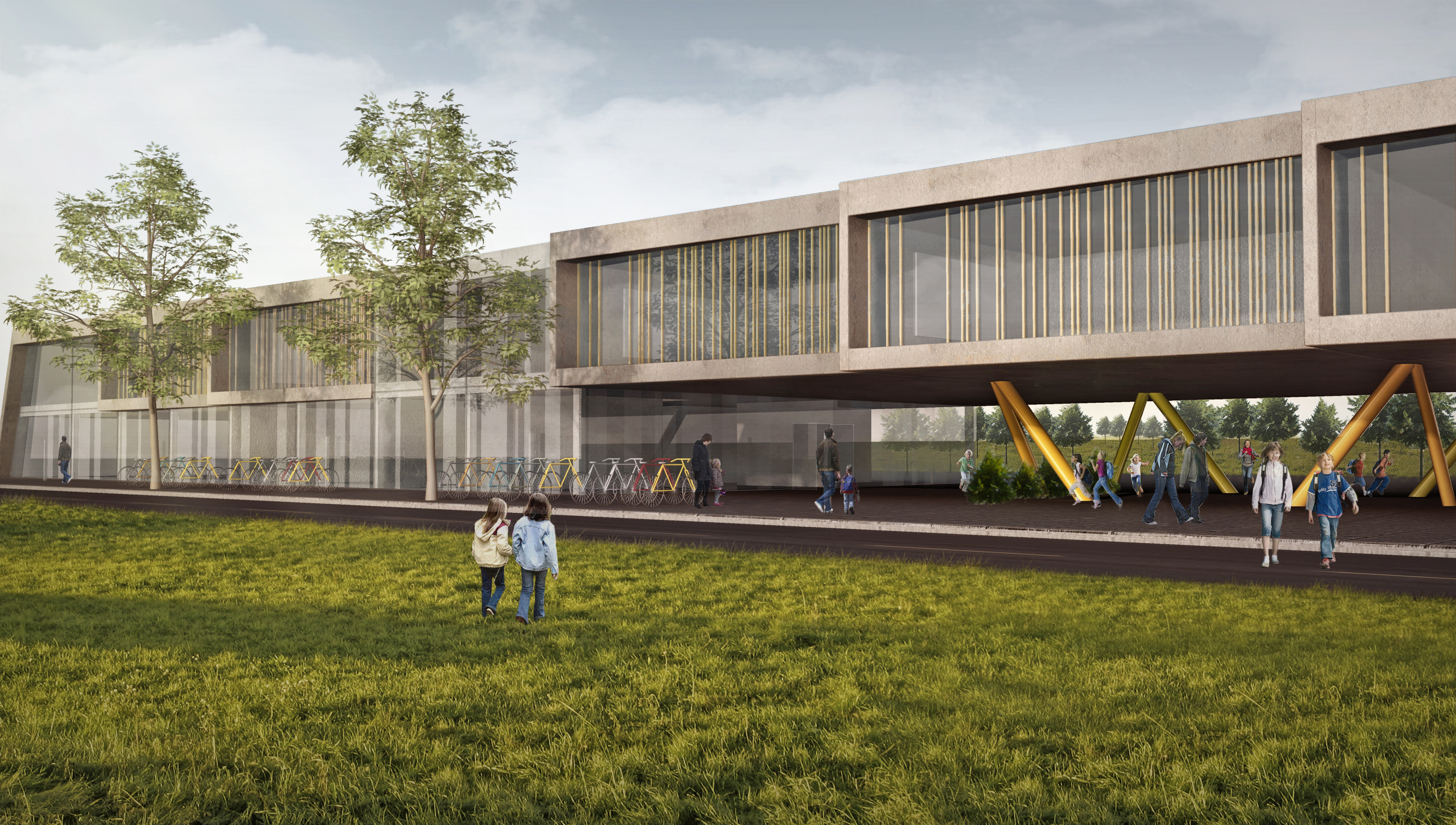 This is an exterior view we made for an architectural competition held in September 2013 at Nyon, Switzerland. The project consists of a long building that provides many different services. Rather than masking its length, we preferred to promote the functional aspects of the design which visually bridges three buildings, and allows pedestrian circulation from city to park.