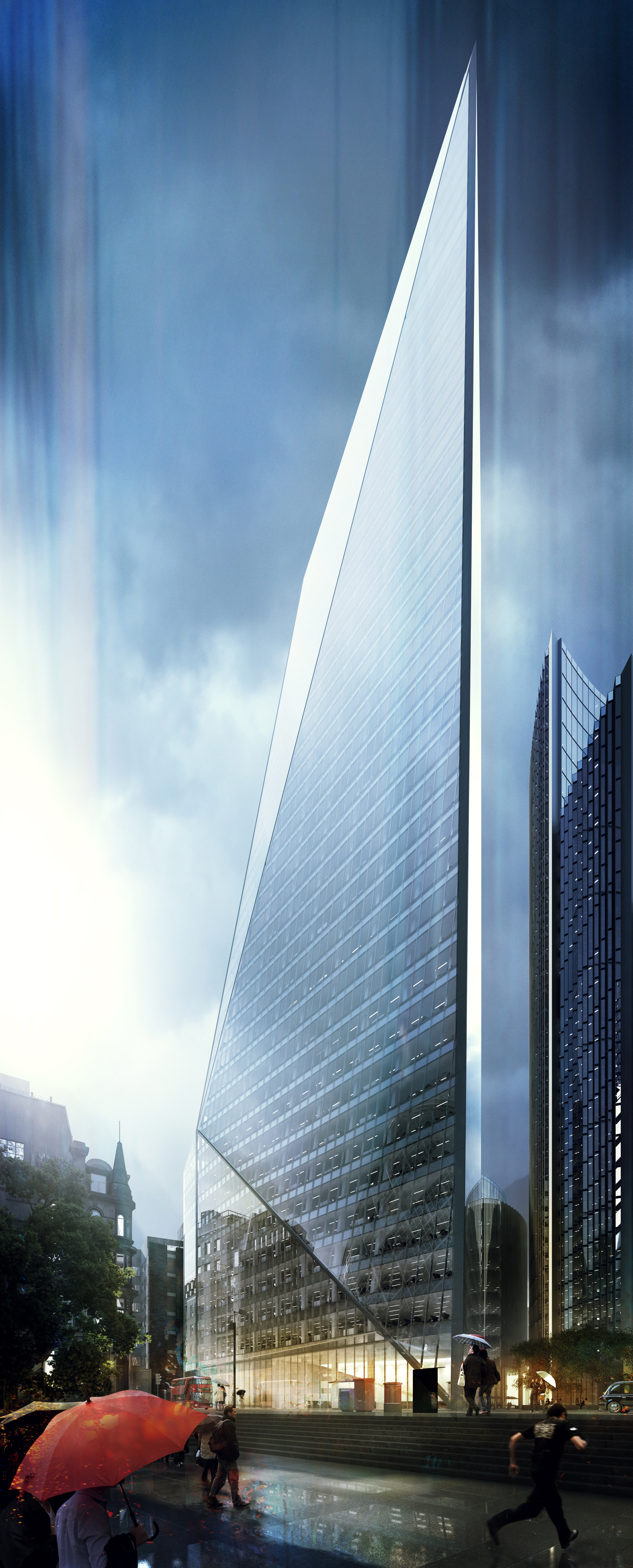 This KPF scheme located in Lime Street London quickly obtained the nickname 'the Needle'. The image 'Needle in the rain' is aimed to emphasize the strong linear design of this scheme and to show the interaction with its surroundings and the environment.