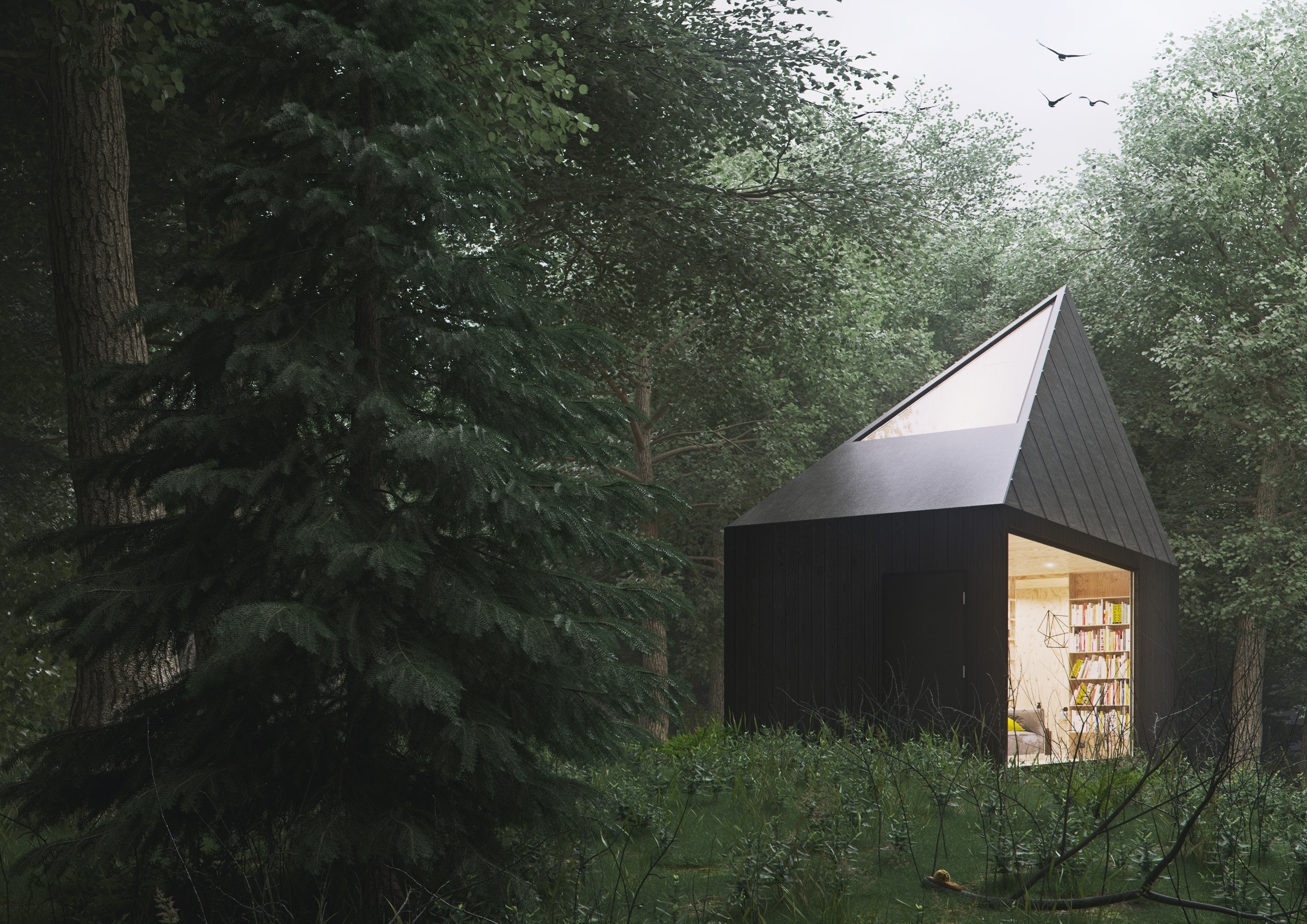 The vision of the place to clear one’s head targeted at the individuals who need rest, seclusion from other people, the world and daily life. A cold, misty forest in the context of a warm space of seclusion is supposed to help and shape character, as well as invoke emotions and willingness to ponder. Both the building itself and the interiors will be designed to affect the flora and fauna as little as possible.