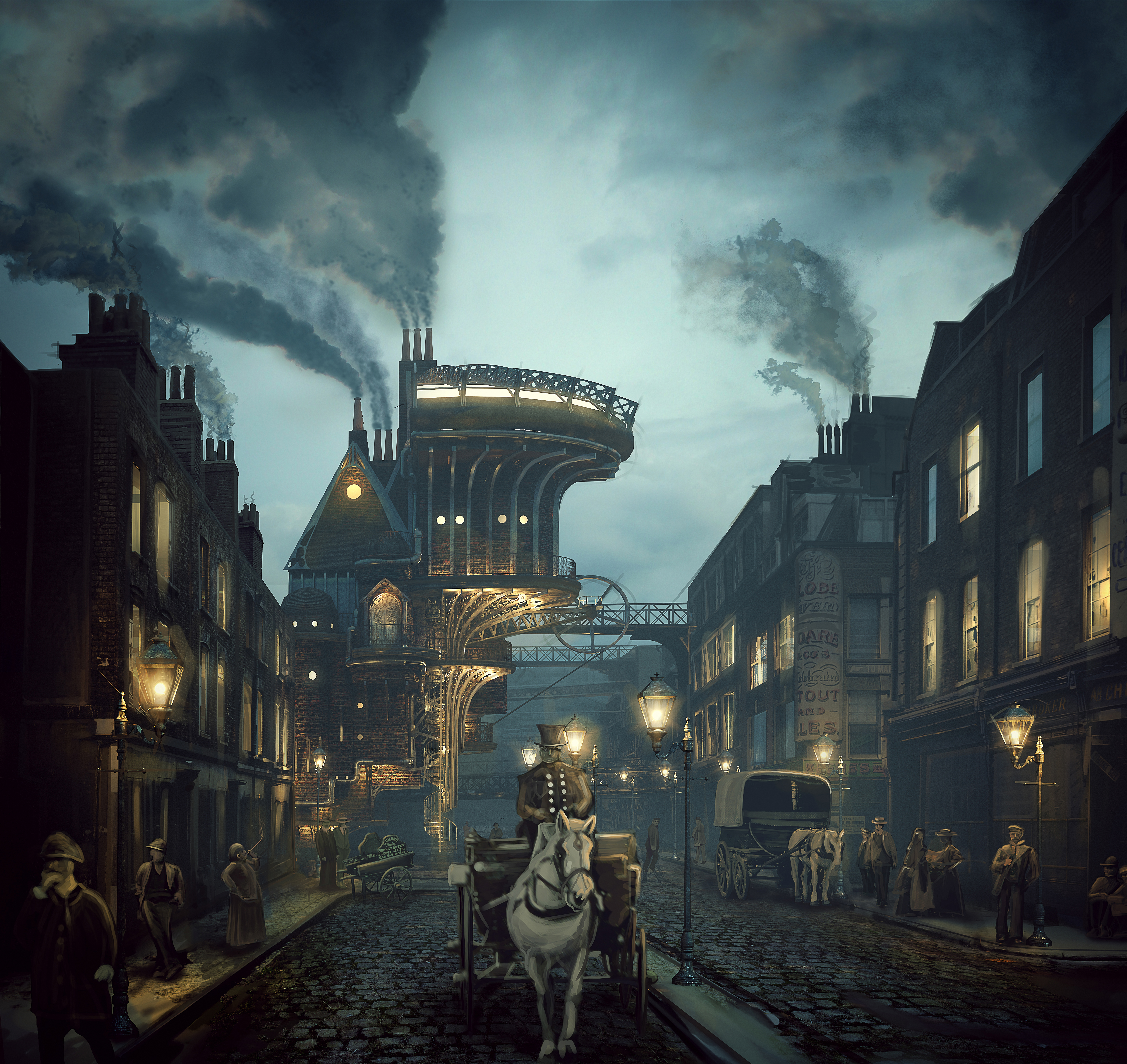 A concept image for a internal pitch document; re-imagining 'A Christmas Carol' scene and it's architecture. The image is a combination of 3D and digital painting.
