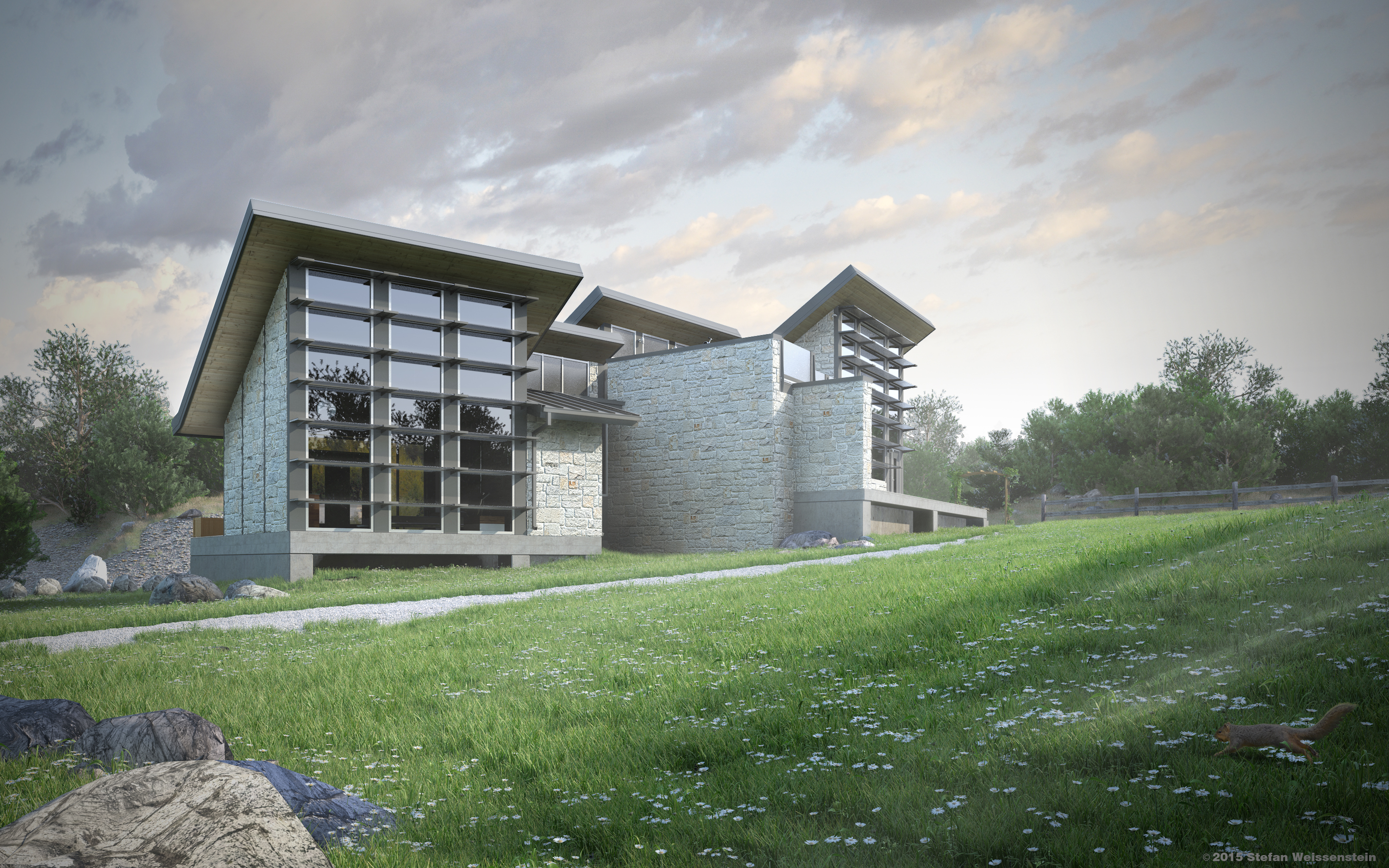 Used 3ds Max 2013, Mental Ray, Forest Pack Pro, xfrog, and Photoshop. The most challenging part of the project was texturing the limestone wall from scratch to match the local quarry materials, as limestone colors vary greatly between regions in the U.S., let alone the world. I laid a 12'x 12' random coursing pattern of Texas Limestone by hand in Photoshop.