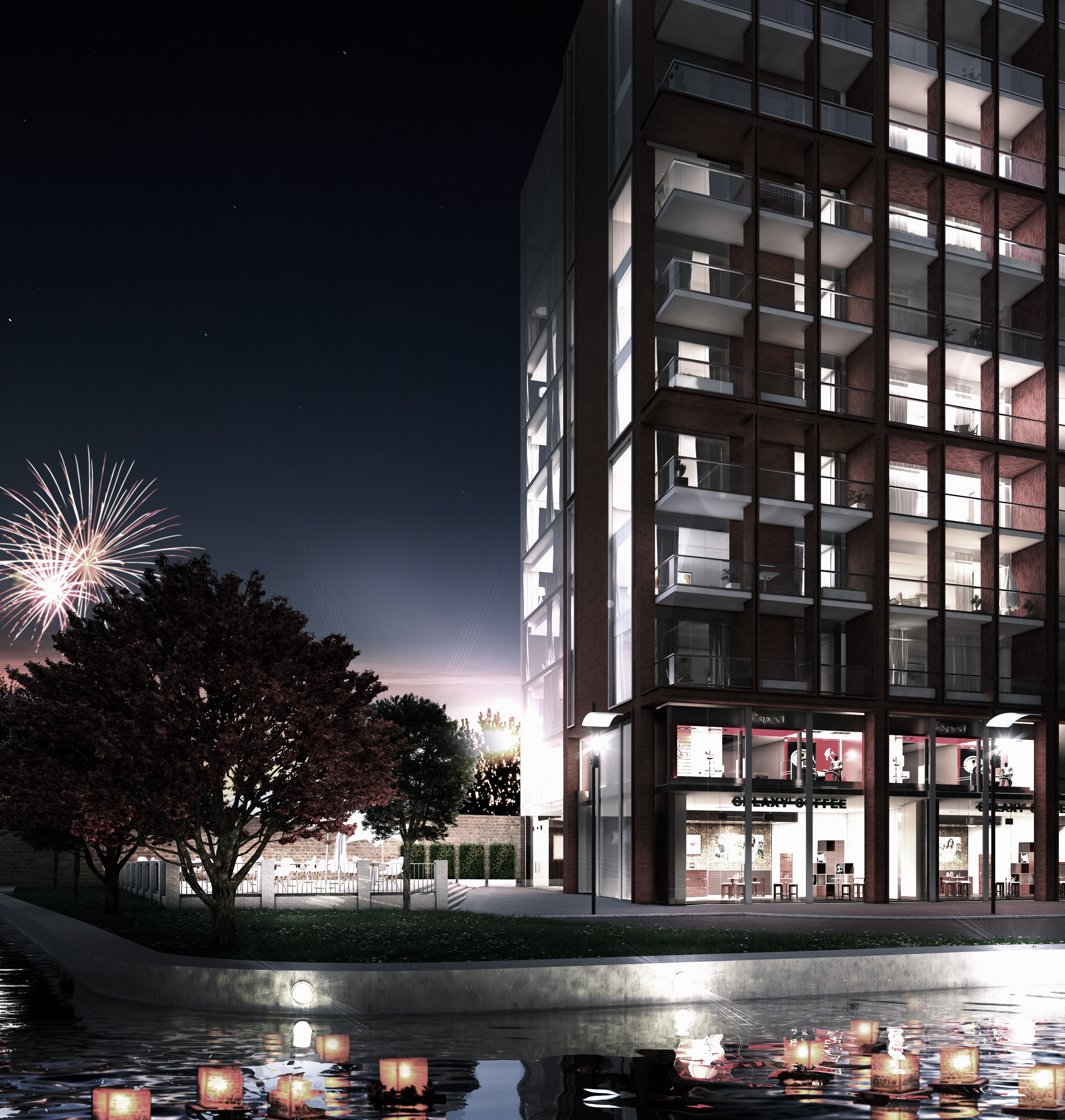 Night time rendering of a canal side serviced apartment development.