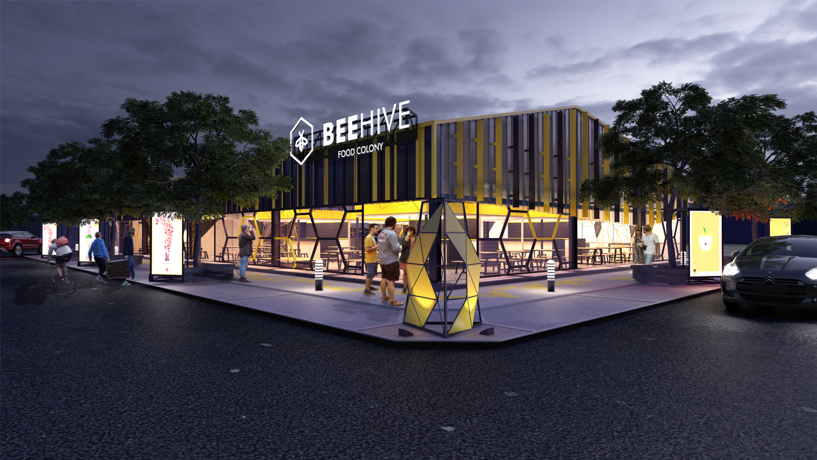 this building designed for food center and a gathering place, the main concept is bee colony. the aplication is in the color theme, ornament shape and the main building purpose itself.