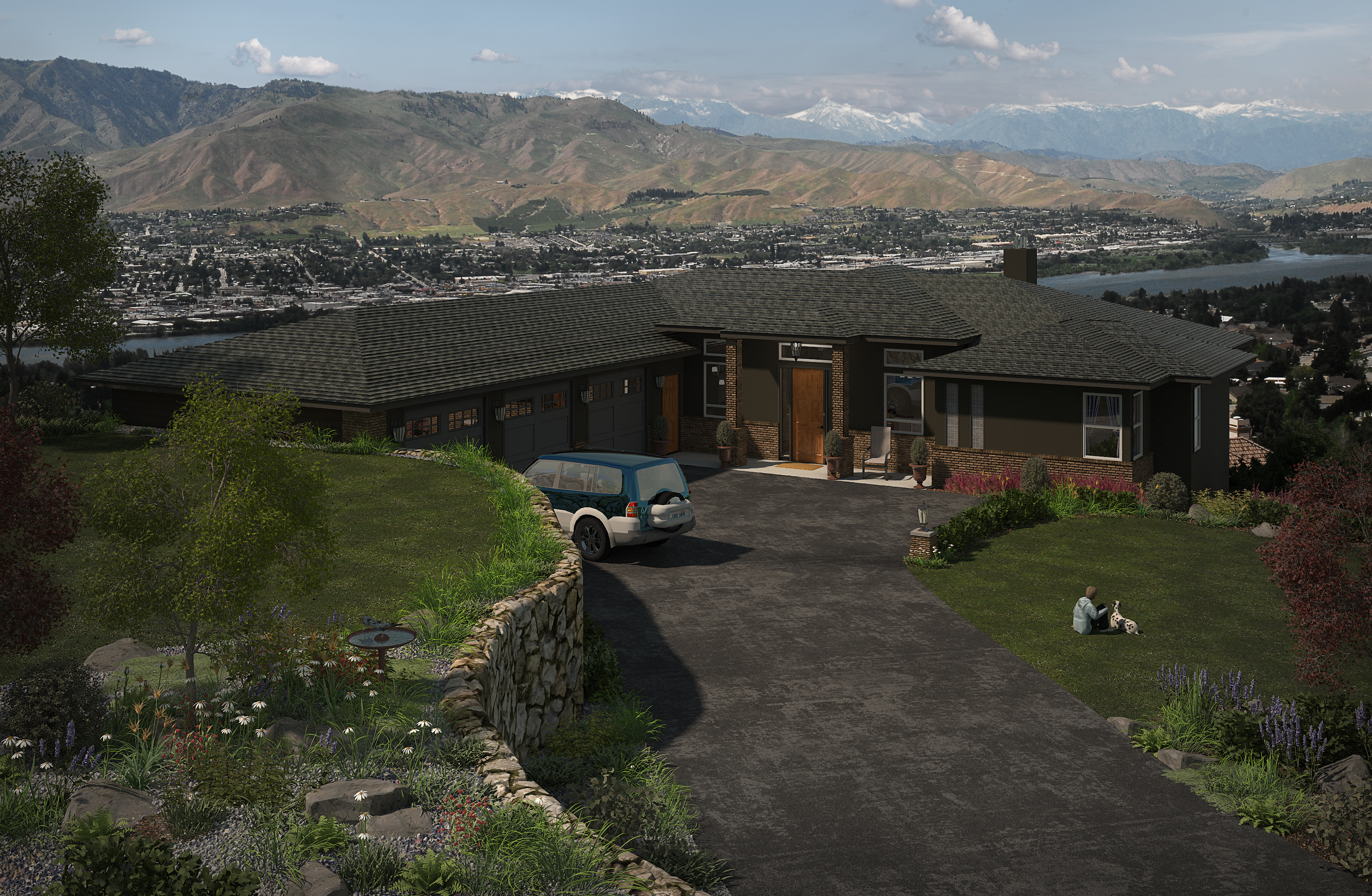 Rendering of home for builder. House will sit on a bluff overlooking this area of the Wenatchee Valley and the confluence of the Columbia and Wenatchee rivers.