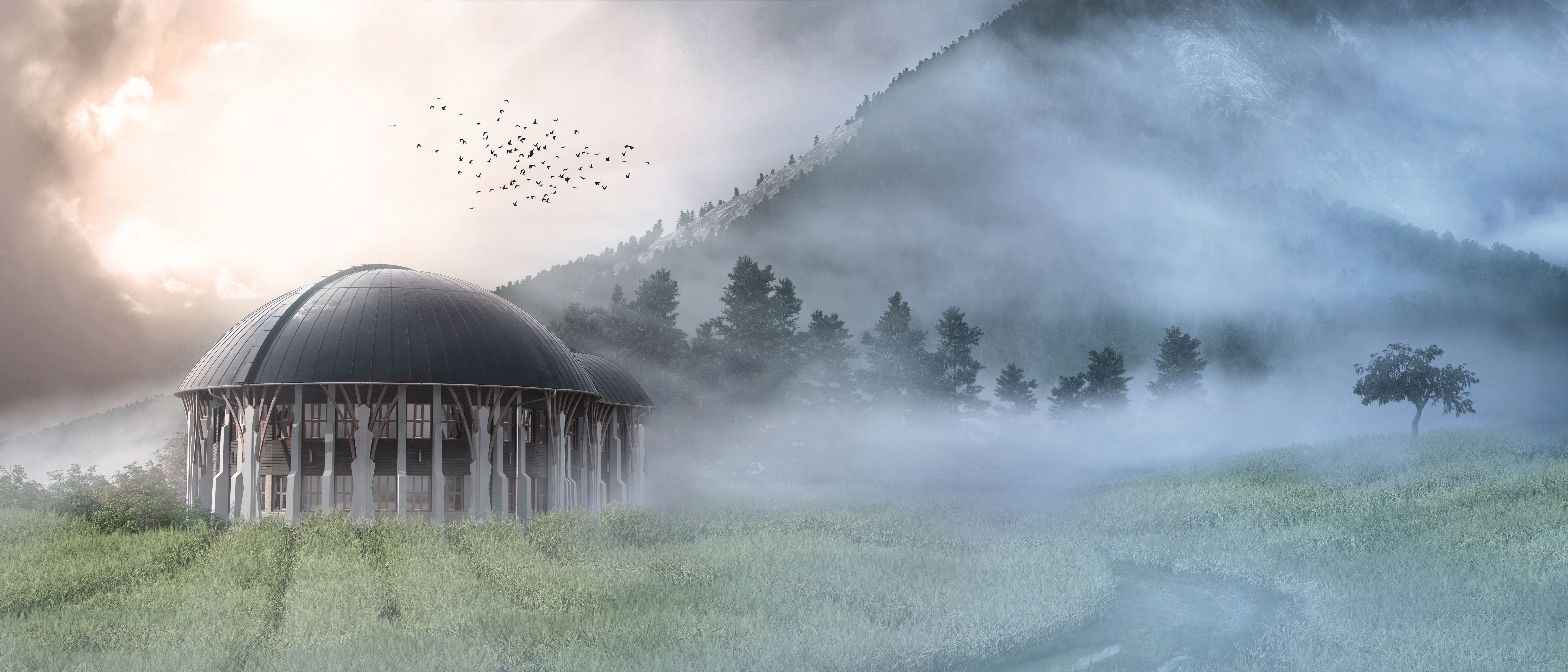 Both the building and the environment are CG except the birds and the fog.