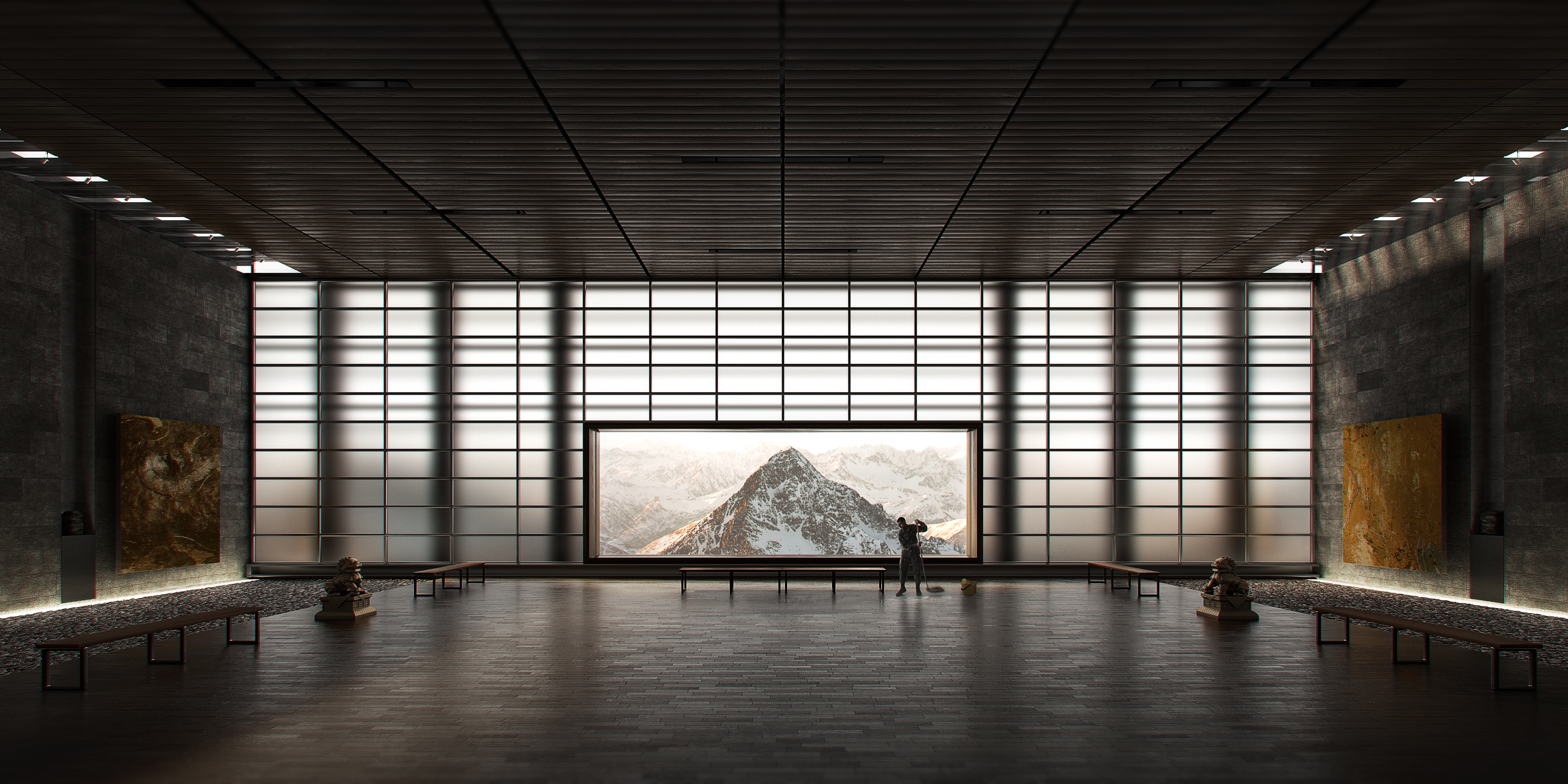 An exhibition space in the snowy mountains before it opens.