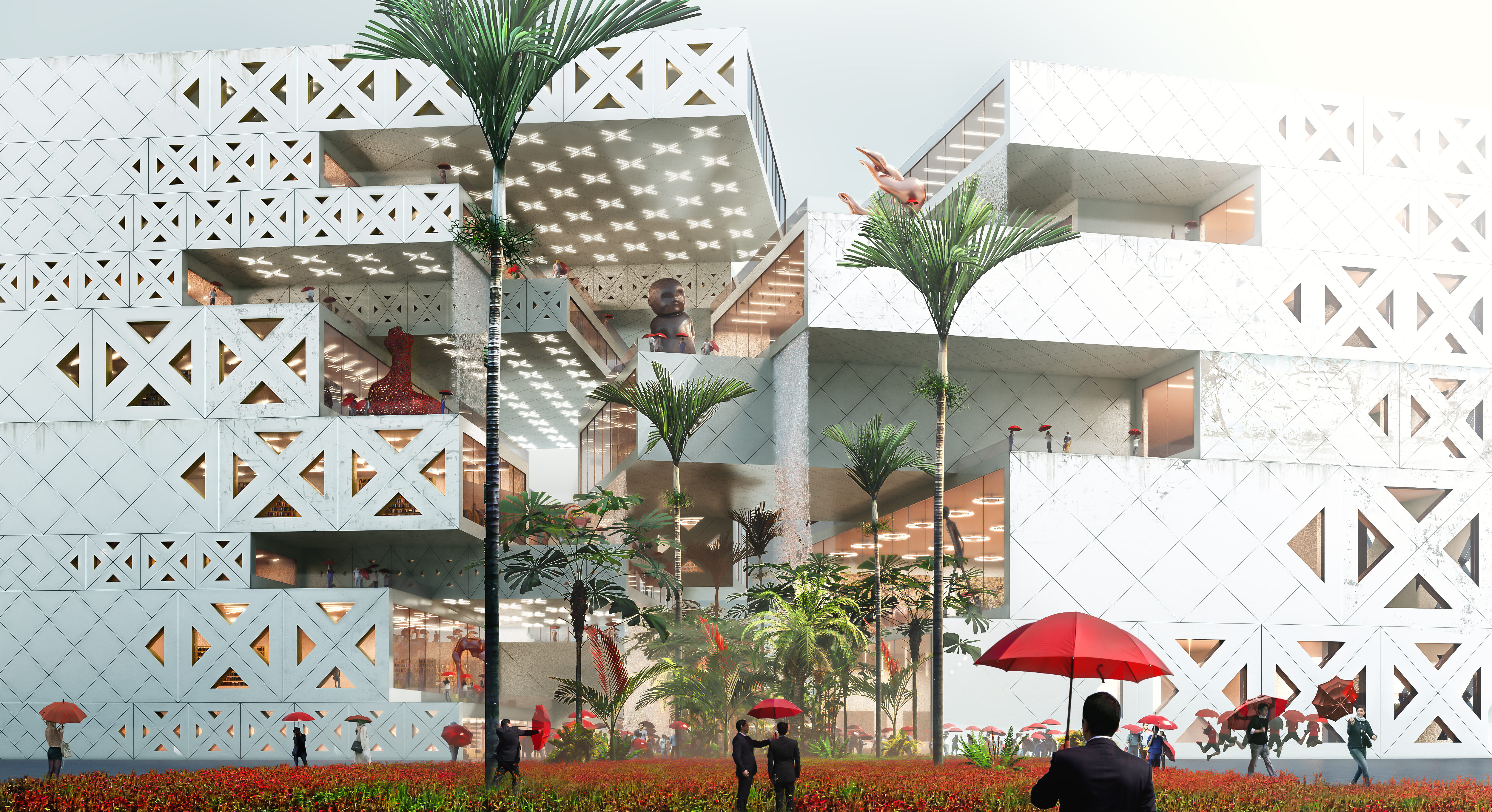Ming & Mei is a proposal for a new cultural gateway in Taichung, Taiwan. Acting as a transitional zone between city and parkscape, its two diverging masses, one a museum and the other a library celebrate the void between them as a grand entrance into the city’s new Gateway Park. Bars protrude at varying distances, articulating their type and use in relation to each other.