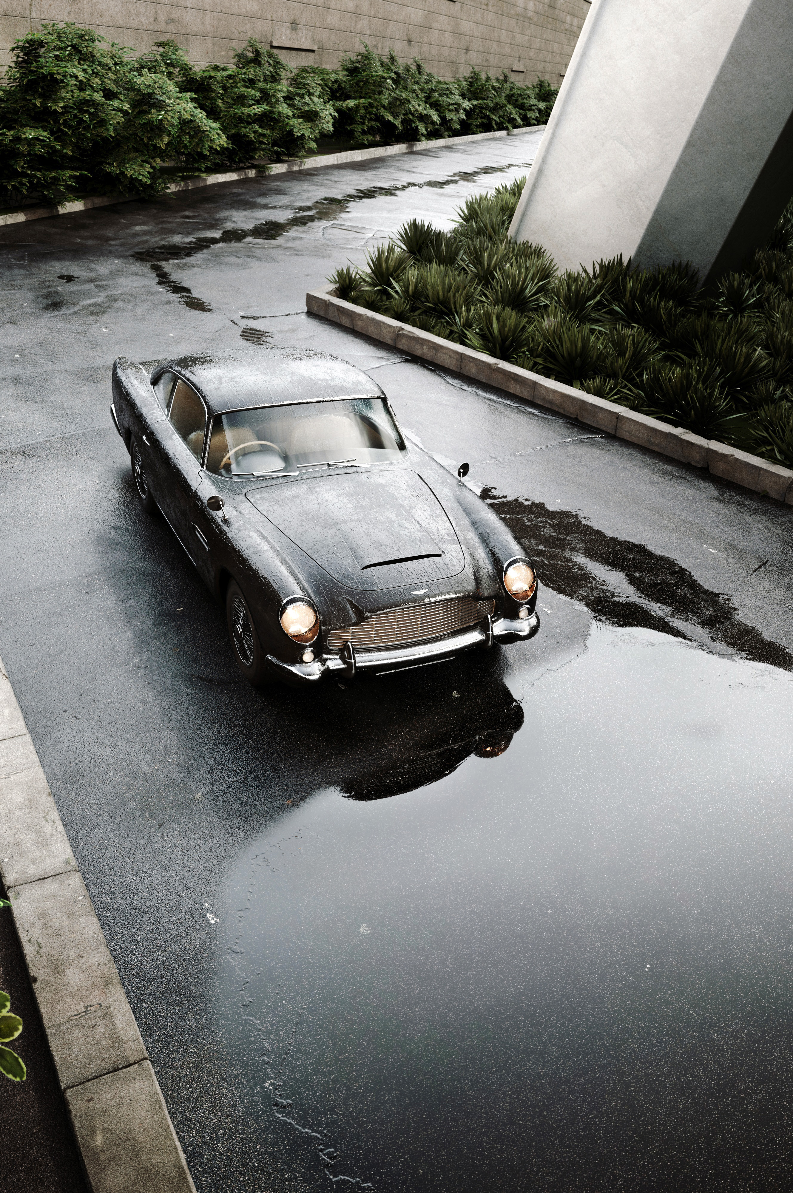 Project has been rendered in Corona rendering engine. Modeling was done in 3Ds Max. Models and textures custom created except the car model. For the raindrops I heavly adjusted texture by Cornelius Dämmrich from his 52Hz project. Asphalt is made of many stitched textures together with custom painted high depth displacement map. Raindrops are placed on the car and windows by using dupicate offset car model refraction layer.