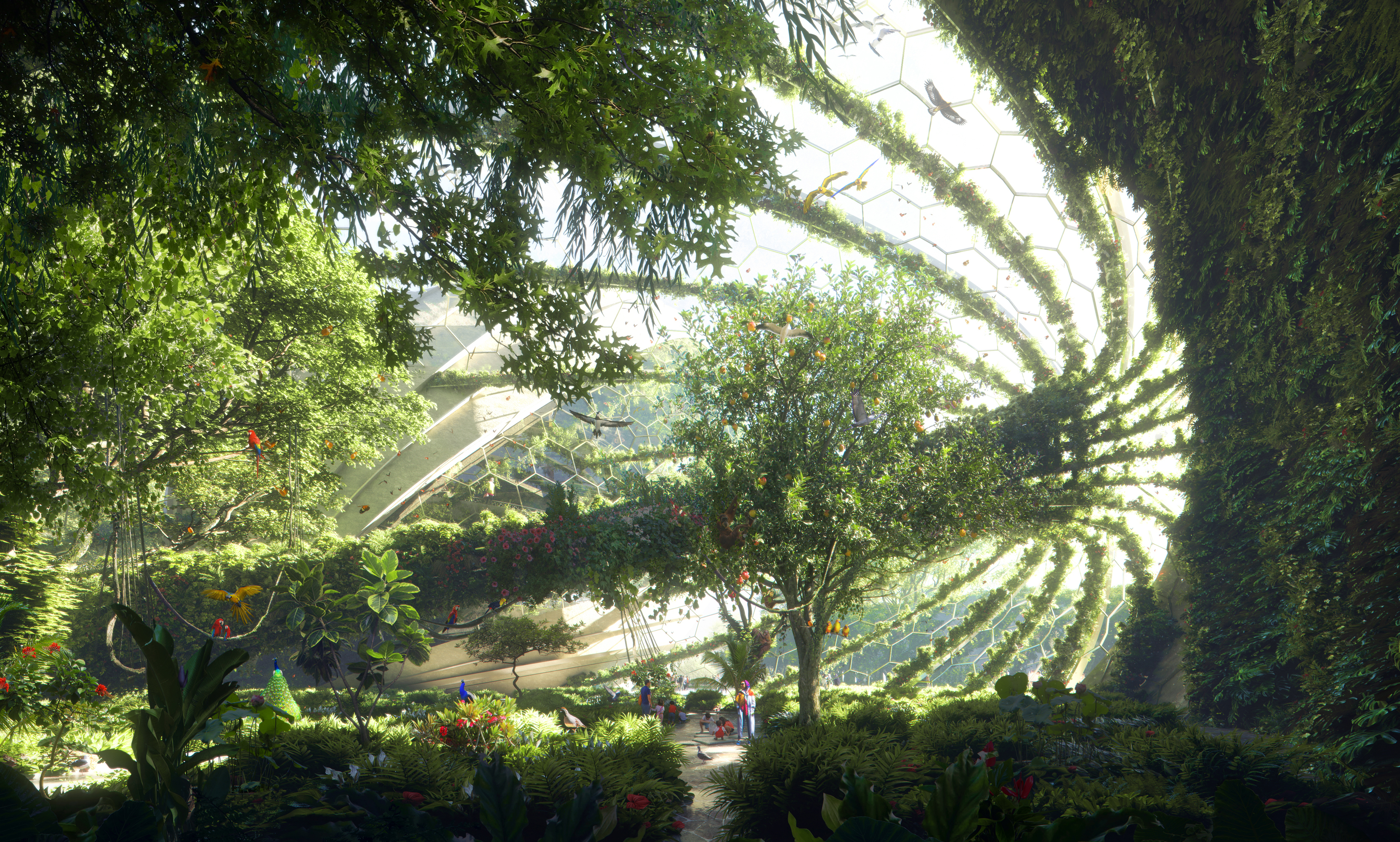 Visually unique, the dome’s structural frame represents a growing tree and the natural cycle of life. Verdant and green, the frame shapes the interior forest, with roots growing deep into the earth at lower levels and large leafy tree branches animating and shaping the upper levels. Digital 3D mapping of animals animate surfaces of trees and vegetation throughout.