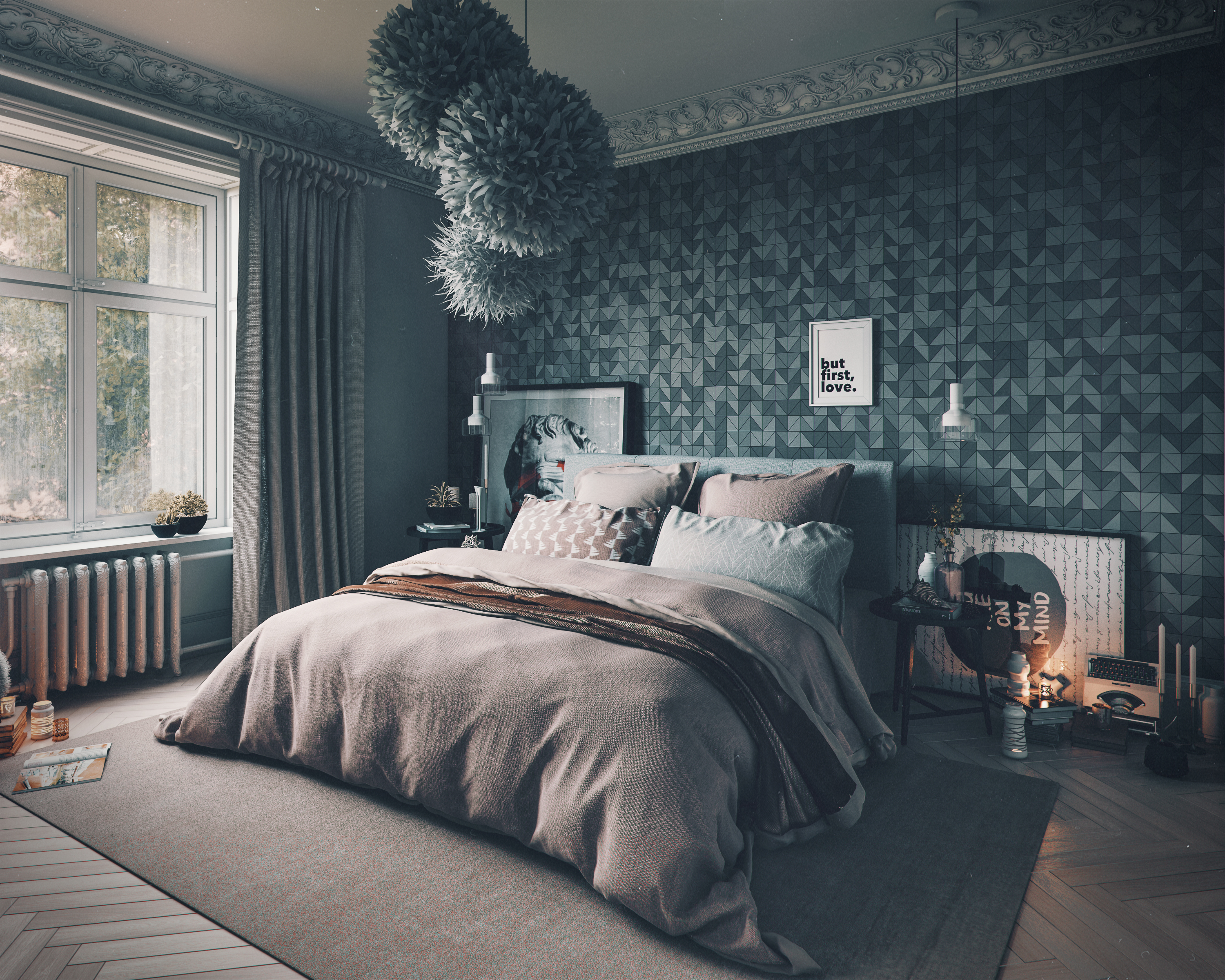 In my work I really wanted to convey air showers, so even at the first stage of planning I have found examples for use in the project. I mixed classic and modern design elements, which gave the room a unique look. Warm light from candles, draws, breaking the gloomy, rainy atmosphere, creating the necessary comfort. I like it so much. I hope you 'll like it too, enjoy the show.