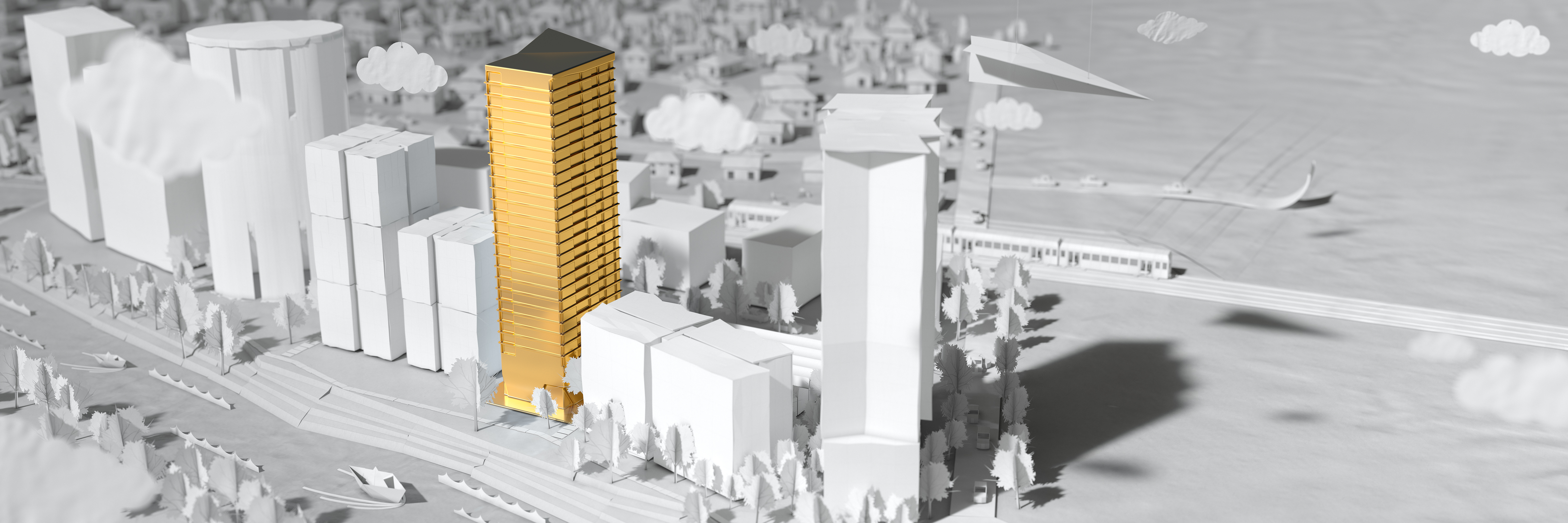 A concept image produced for a paper city idea, the city folding out from the centre building.