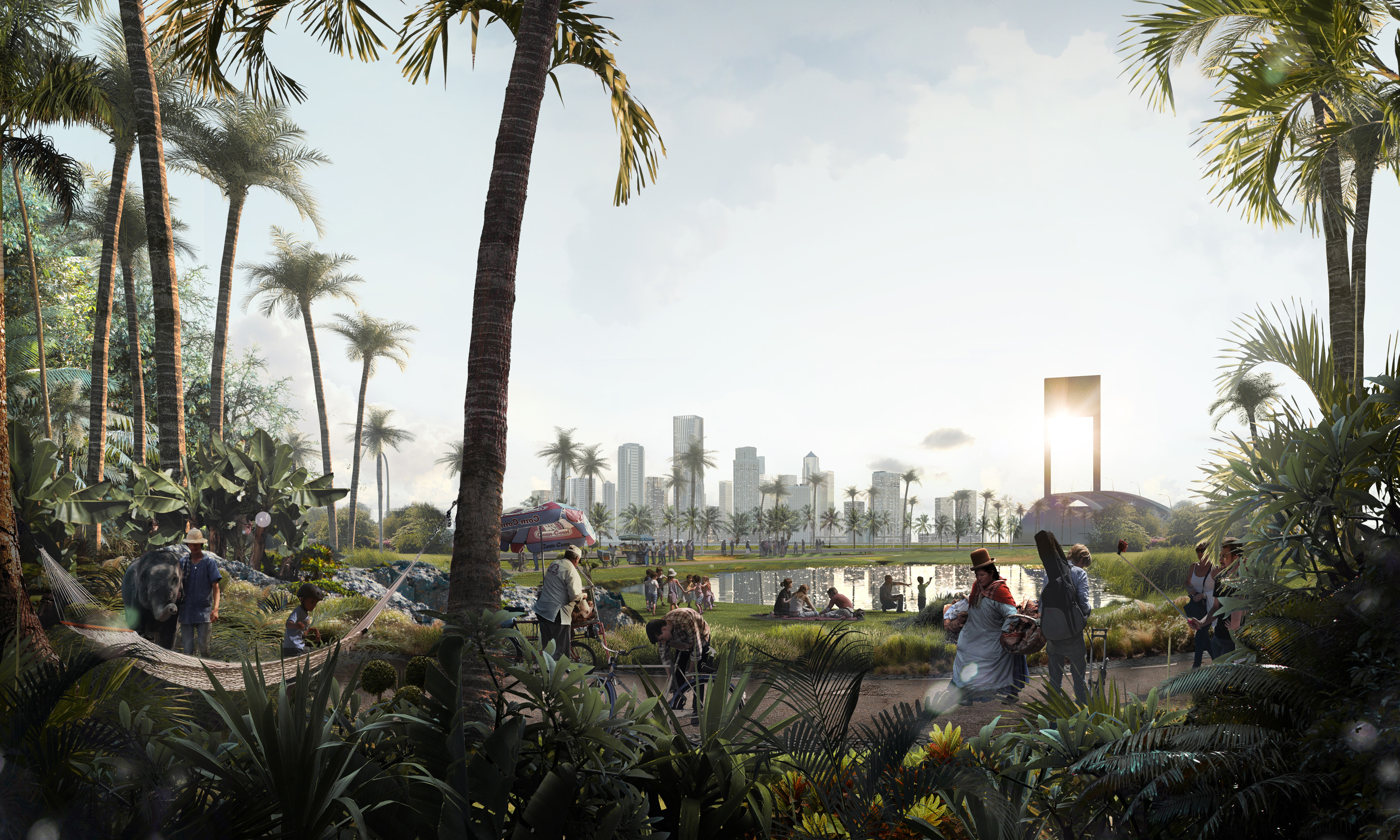 Free-time work. Diverse approach to an imaginary park, near a newborn city.