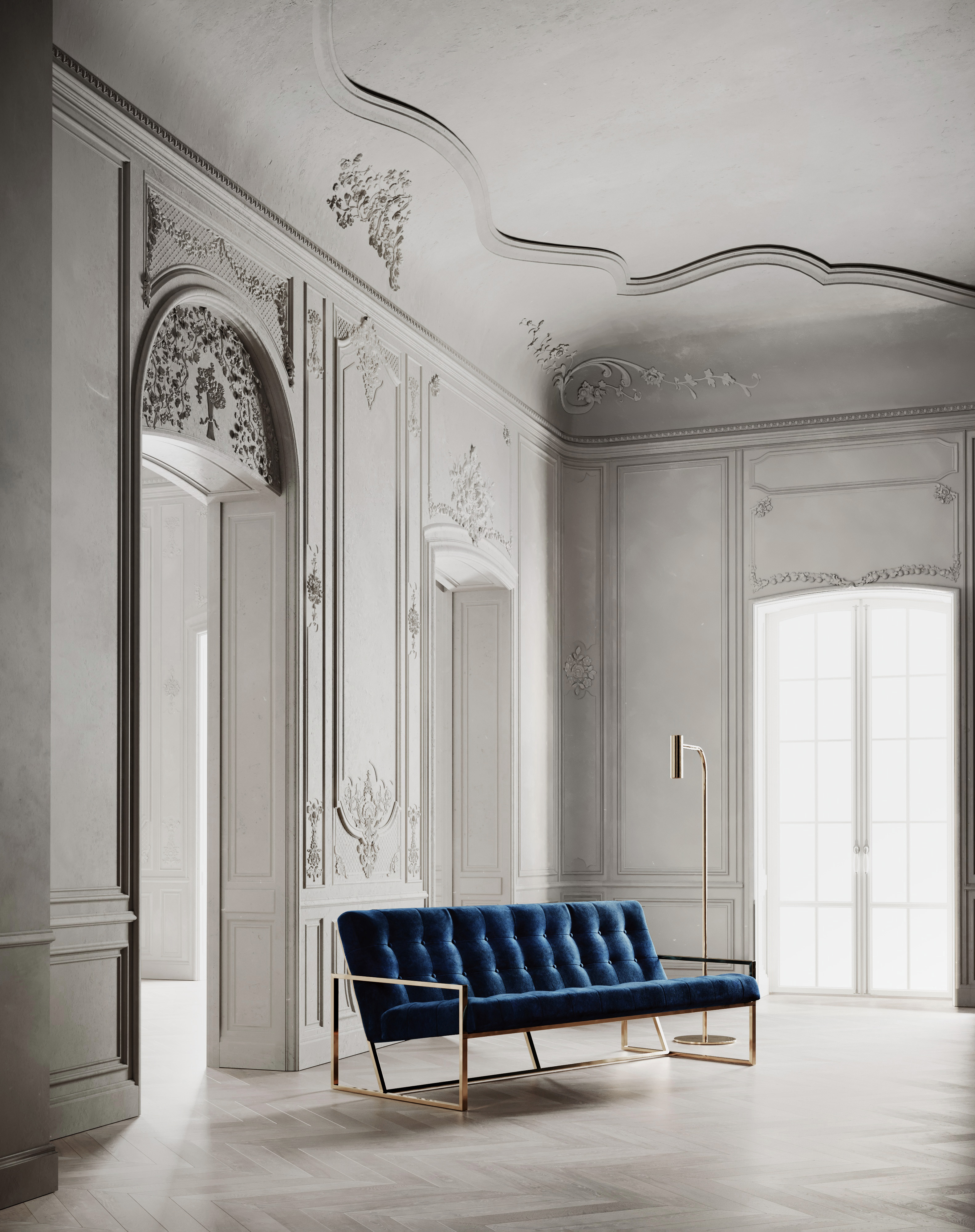 Classic Nowness is an imaginary Classic space filled with Contemporary furniture pieces to shape a modern Icon of classic nowness. It depicts passion, beauty and contrast in classic Stone Mouldings and Contemporary minimalistic furniture. Pasion in contrast between Beige, Gold and Deep Blue. Beauty in contrast between Structured surfaces and Flat surfaces. Beauty and contrast in materials Metal Gold and Velvet blue. Passion in contrast between Curves and Lines.