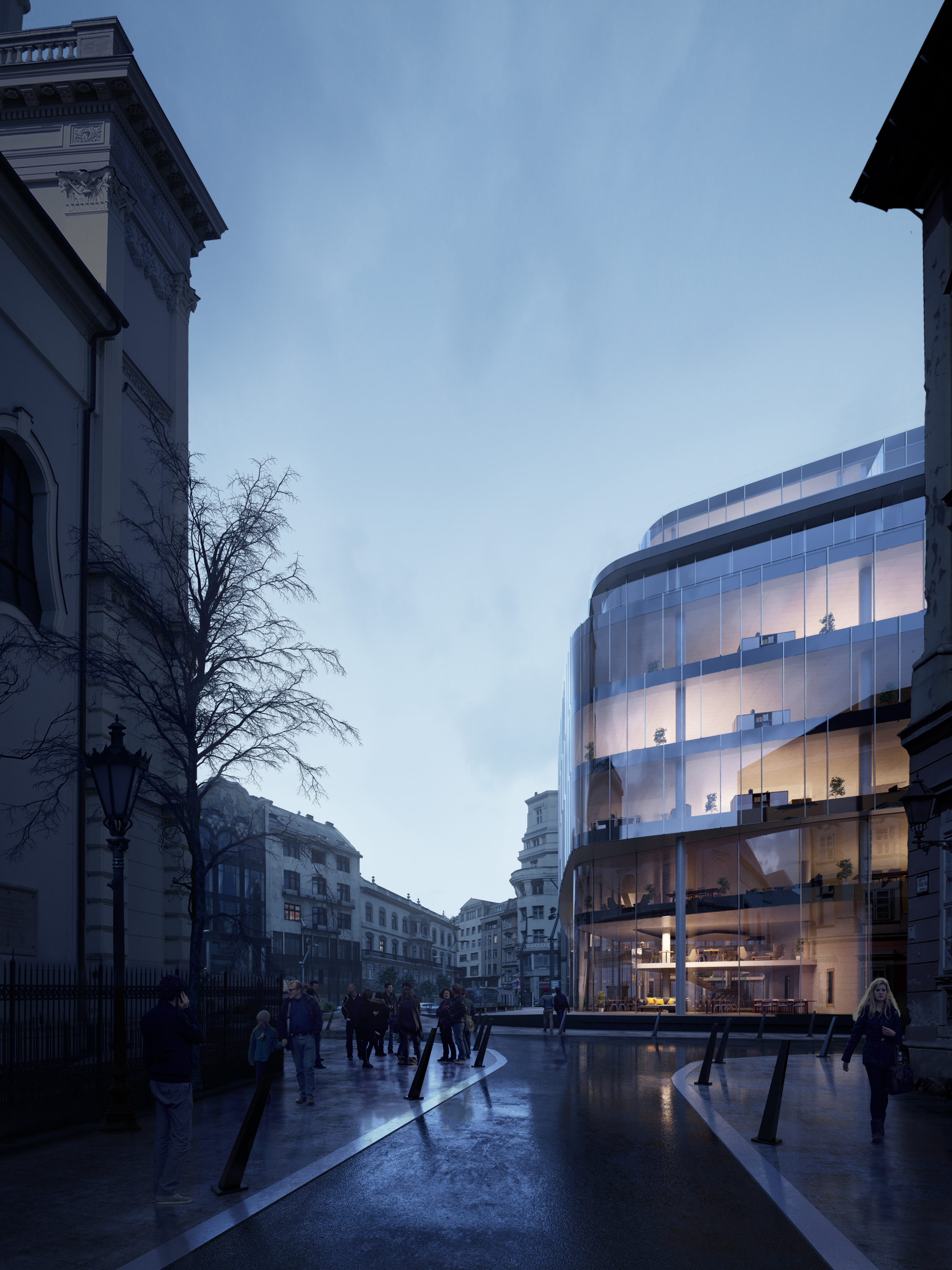 The smooth contrast of blue exterior colours and warm interior colours create a nice harmony, multiplied by the reflections of the wet pavement.