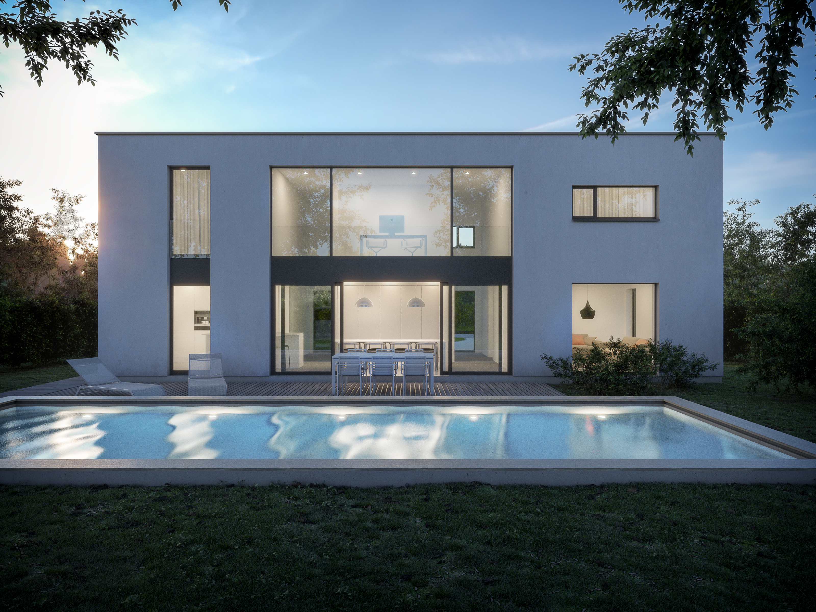 Dusk pool scene of a single family house in Belgium.
