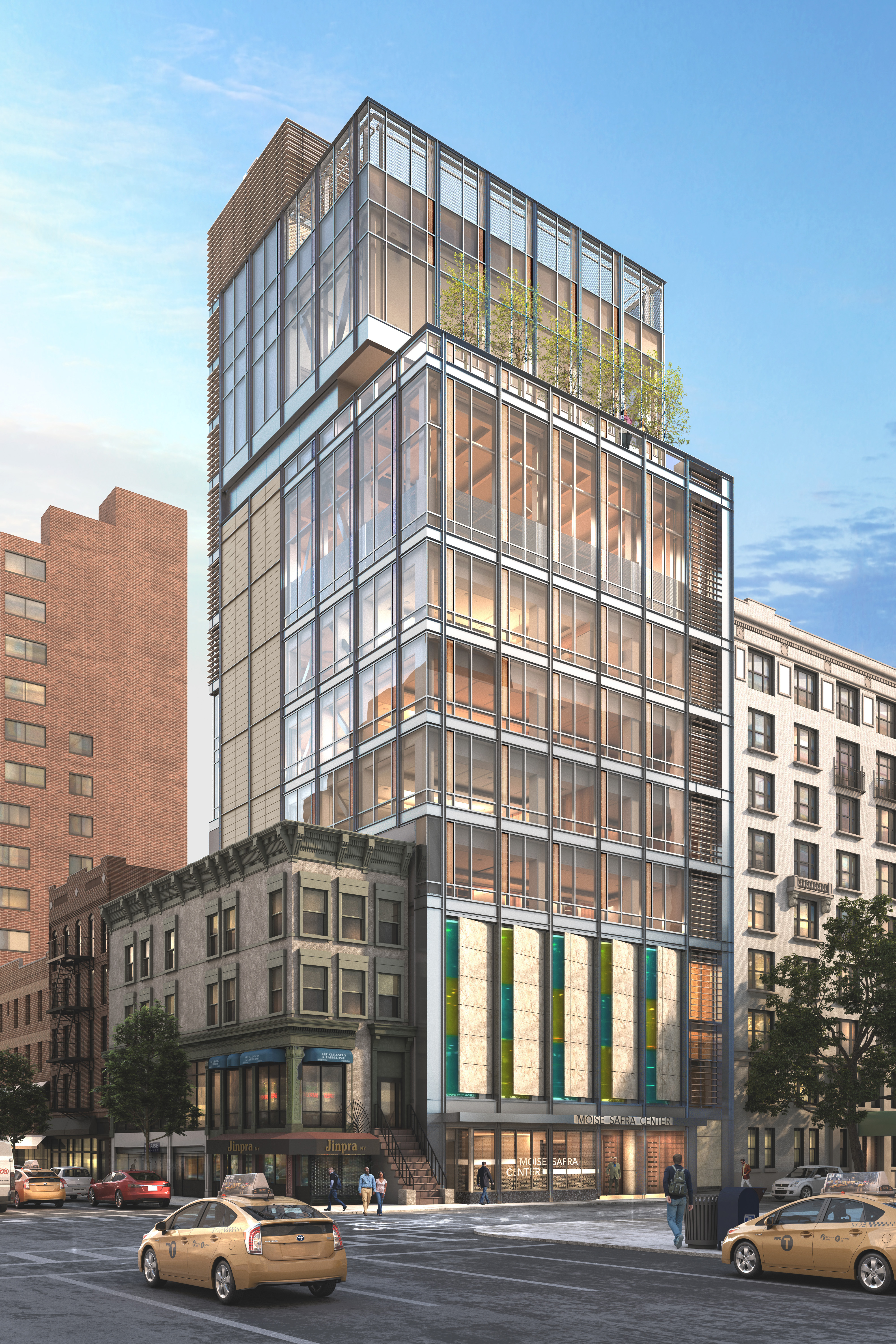 Overall exterior dusk rendering of the Moise Safra Center, a mixed-use community center currently under construction in the Upper East Side neighborhood of Manhattan.
